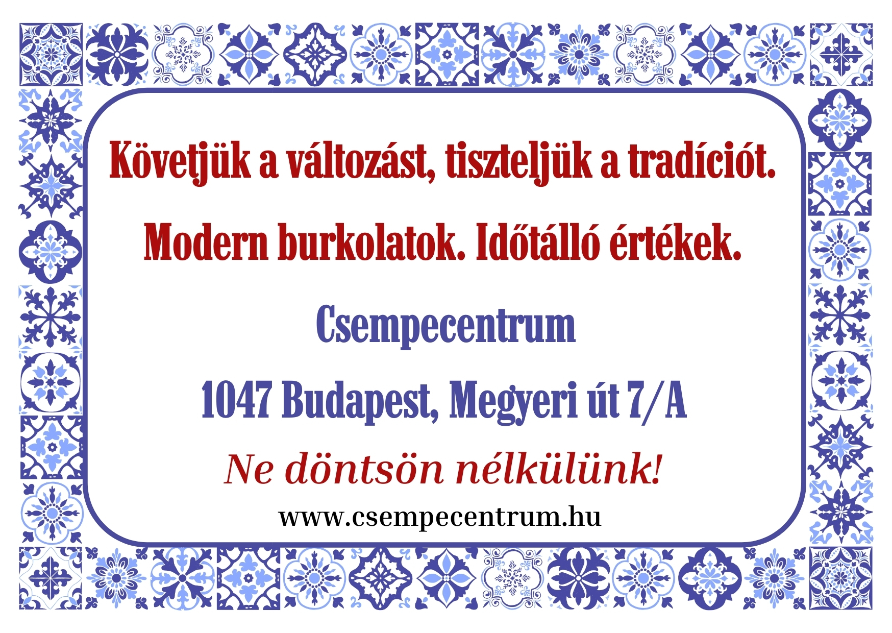 Csempecentrum bemutatóterem:1047 Budapest, Megyeri út 7/A